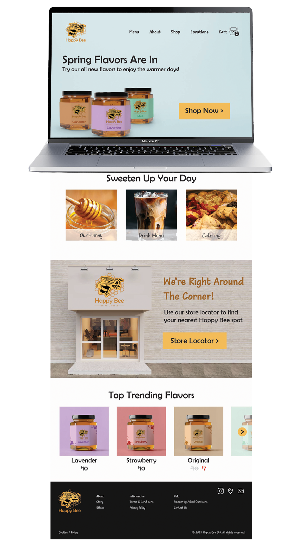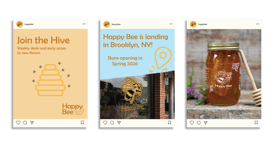 Below is a branding collection for an organic honey company called Happy Bee. This company has recently expanded to an in-person store where they were able to now provide breakfast items to customers as their business continues to grow.